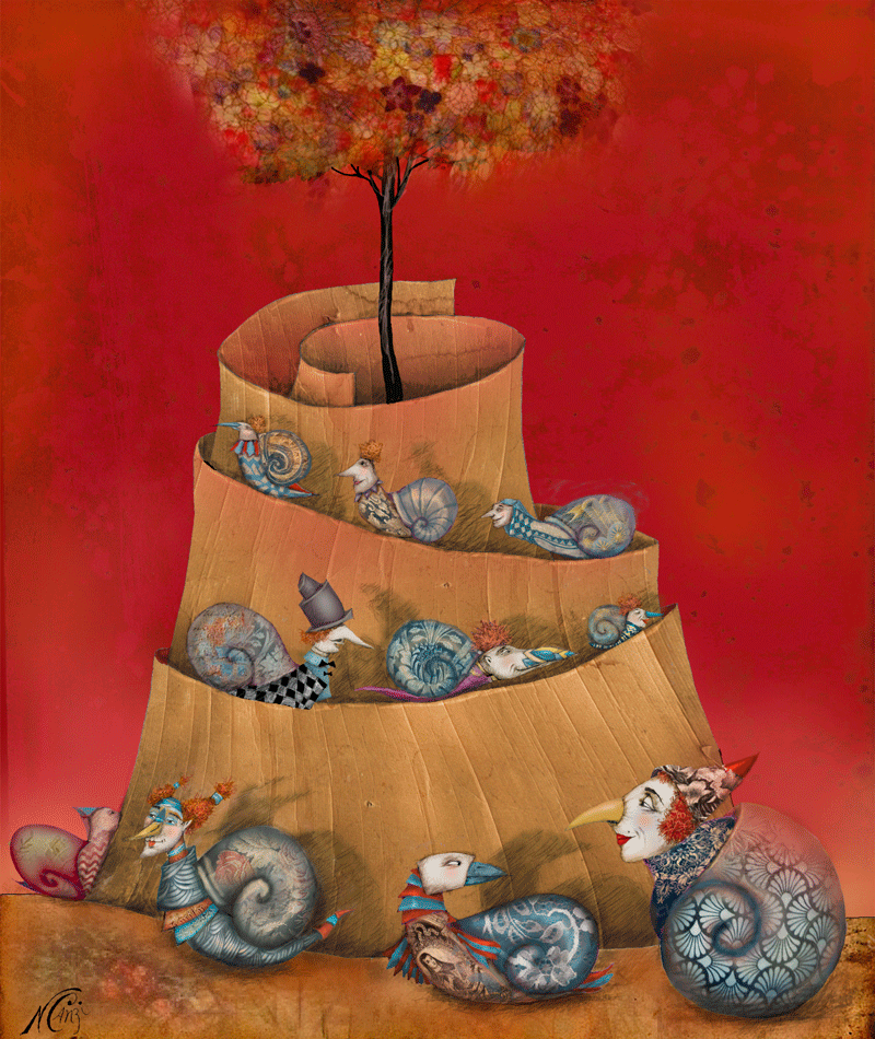 Cuando culmina la noche y el cielo se pinta de fuego ,los habitantes de Karacolia comienzan un lento peregrinaje hacia el fondo de la tierra donde enhebran collares con gotas de lluvia . (Imagen y texto míos)